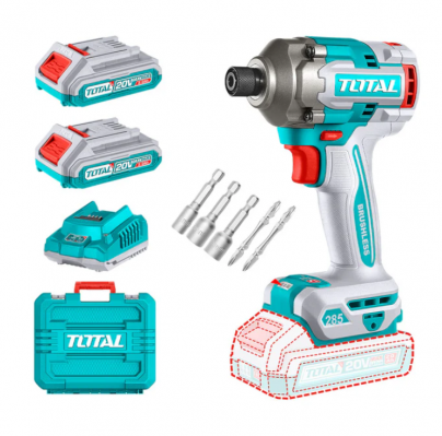 Atornillador de Impacto Inalámbrico Total, conexión 20V. Viene con dos baterias de 2.0Ah. Código TIRLI2028-7. Tecnoplogia sin carbones Brushless. Torque...